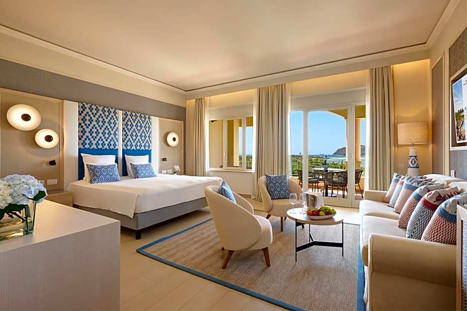 Junior Suite Bay View is 431 square feet and includes a king-size bed 150-183 width plus a sofa bed plus balcony, terrace, desk, hairdryer, tea and coffee making facilities , bathrobes, and slippers.